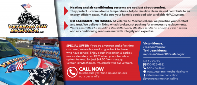 Veteran Air Mechanical is a heating, venting and air conditioning company specializing in HVAC repair and installation services! |